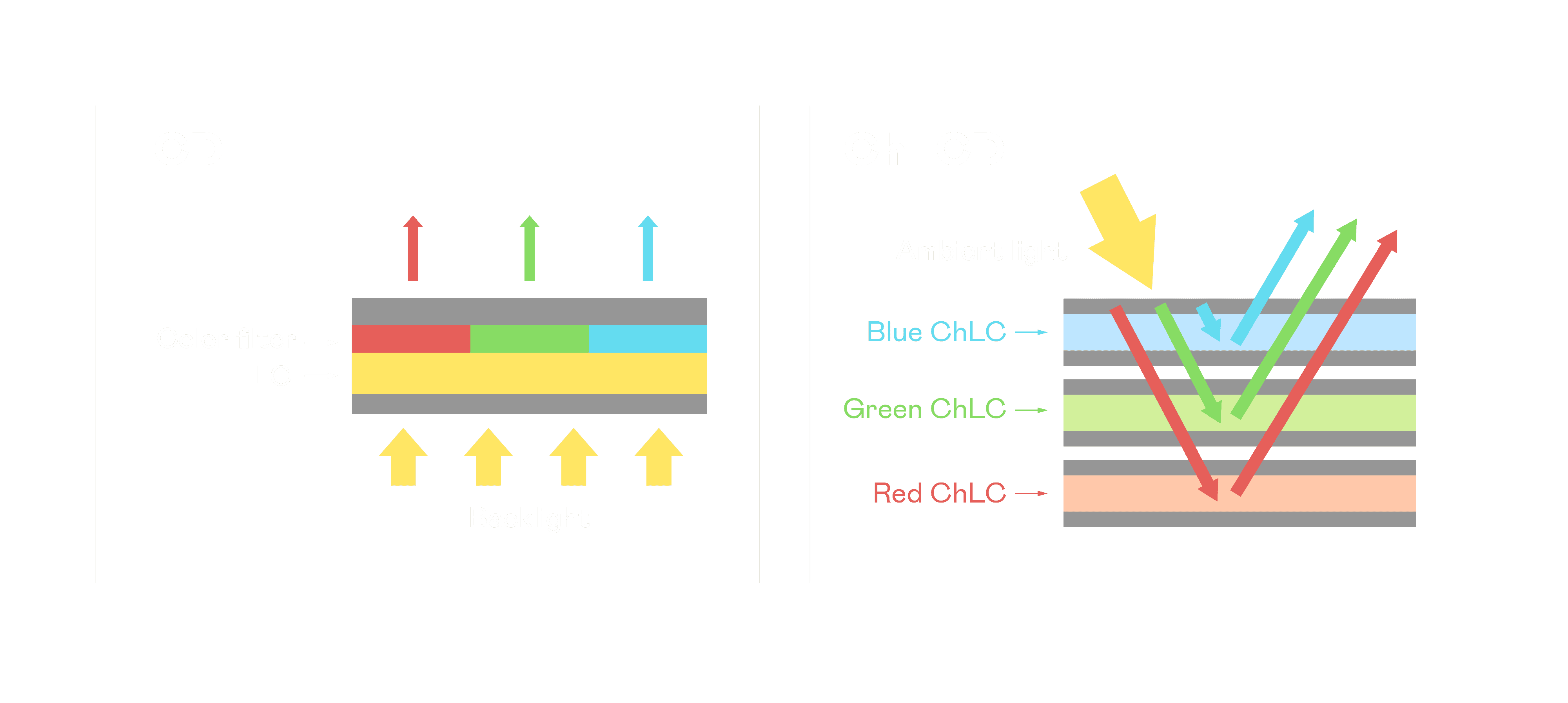 ChLCD 胆固醇液晶就如同纸张一样,,,透过反射环境光来显示影像,,,因此长时间观看不易造成人眼视觉疲劳,,,可达到护眼效果。。。当处于户外阳光下使用,,,LCD 影像容易失真而不易观看,,,,但胆固醇液晶仍可维持较佳的影像品质。。。