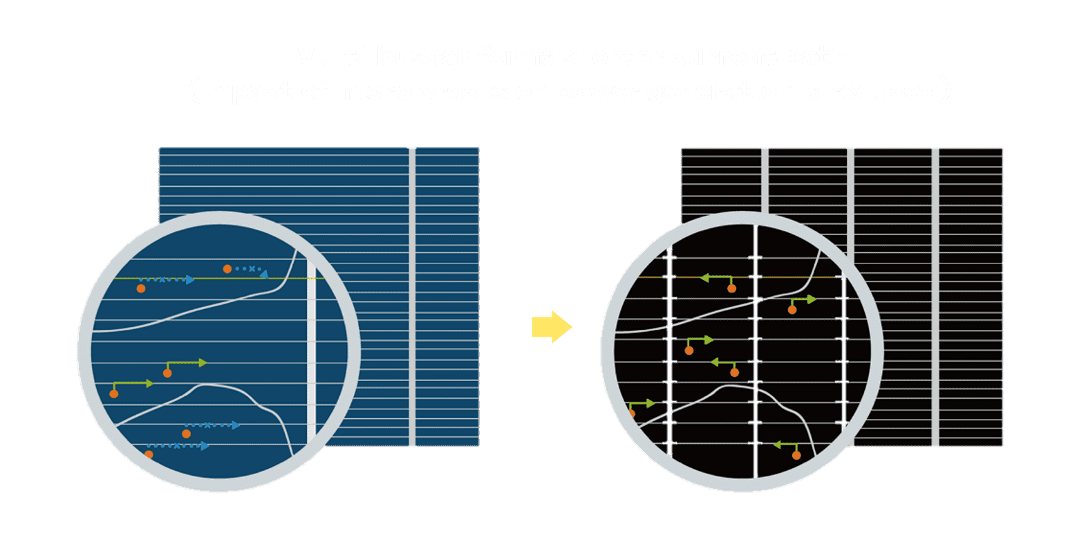 - 电池使用多条铜导线 (Copper wire) 于电池片上形成较短的电流路径,,,提高电流收集效率,,采用圆形设计的铜导线较传统扁平式的铜焊带 (Ribbon),,可增加入射至电池的光线量。。。