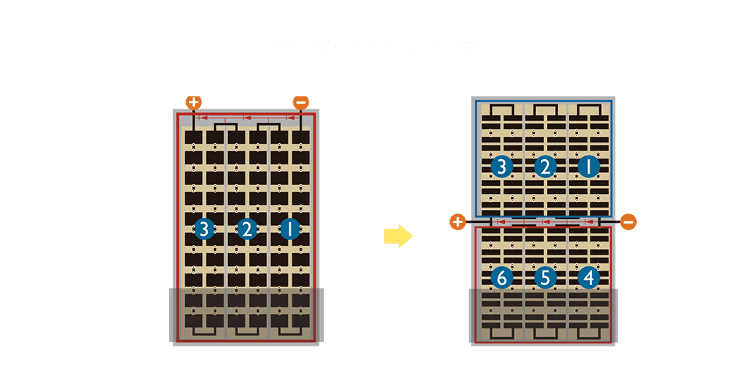 - 结合半切电池,,,,降低遮阴影响、、、、提升模组抗隐裂能力、、、并减少电阻损耗,,,进一步提升模组发电效能。。。
