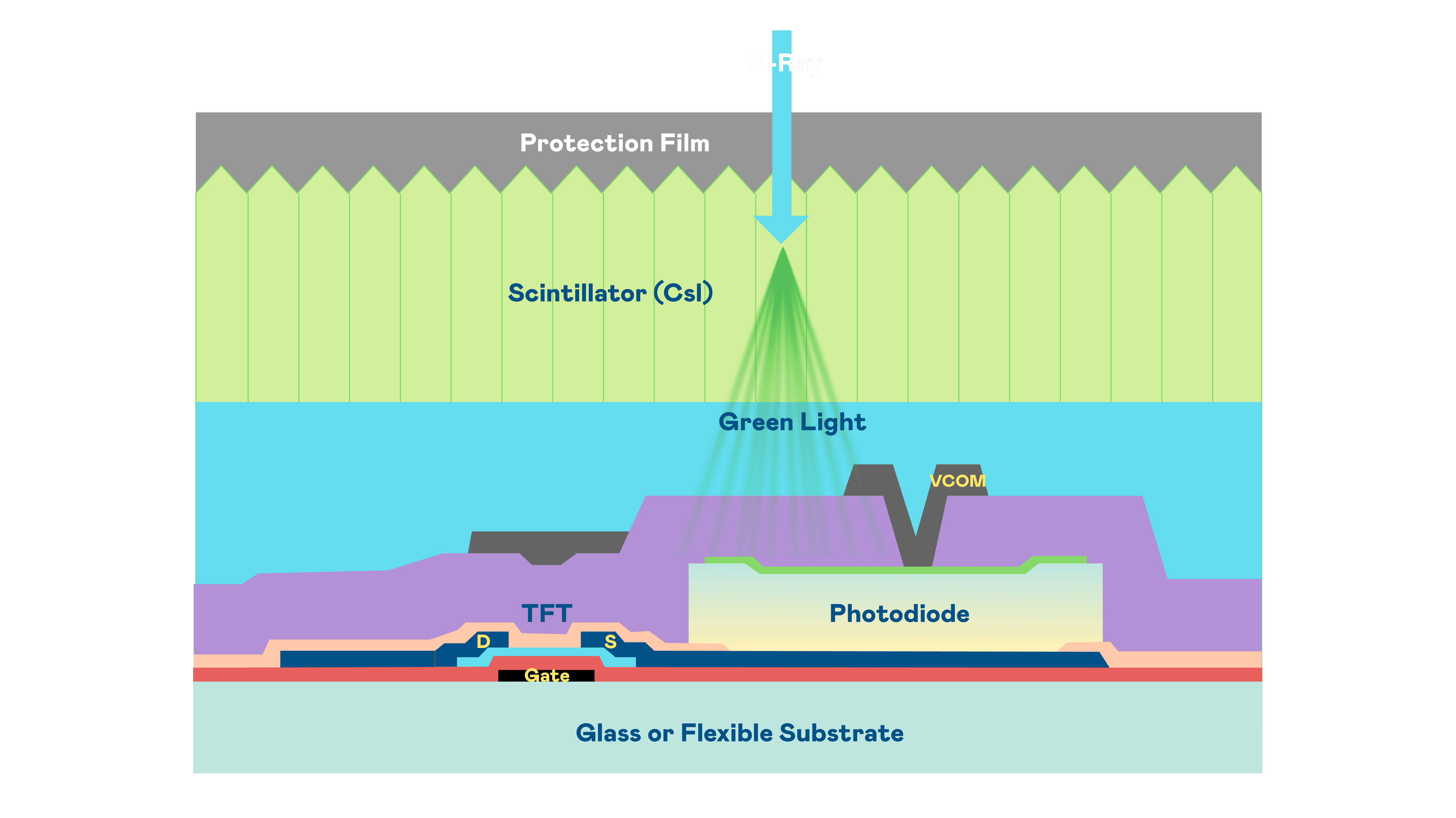 OBPay的X光影像感测阵列使用薄膜电晶体 (TFT) 作为每个像素的读取开关,,,,搭配光电二极体(Photodiode)的光电转换元件,,用以感测X光影像讯号。。。